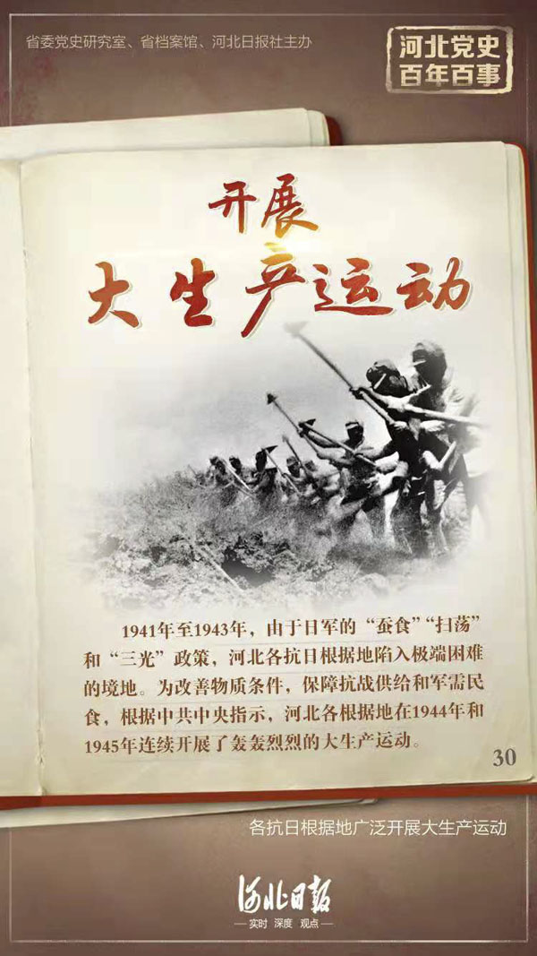 1941年至1943年,由于日军的“蚕食”“扫荡”和“三光”政策,河北各抗日根据地陷入极端困难的境地。为改善物质条件,保障抗战供给和军需民食,根据中共中央指示,河北各根据地在1944年和1945年连续开展了轰轰烈烈的大生产运动。各根据地建立了大生产运动领导机构,广泛发动群众,组织拨工组、互助组、复工队,进行开荒、平沟、开渠造井,扩大耕地面积和可浇地面积。在灾区,以开展生产自救为中心,组织农副业、运输业相结合的劳动互助。部队也在战斗间隙进行生产。为了指导改进农业技术,各地还成立了农业指导所,培训干部,组织劳动竞赛,建立试验组等。同时还组织起纺织、榨油、造纸、农具、医药、煤炭、熬盐等各种生产合作社,并发展了军需工业。