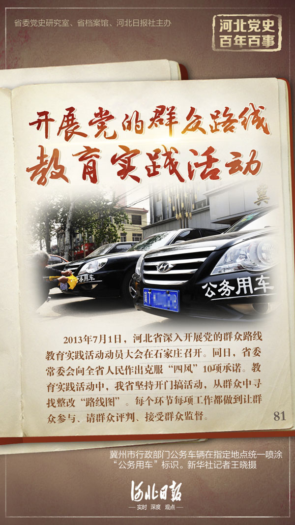 教育实践活动中,河北省坚持开门搞活动,从群众中寻找整改路线图。每个环节每项工作都做到让群众参与、请群众评判、接受群众监督。其中,以中央八项规定和《党政机关厉行节约反对浪费条例》为切入点,处置违规公务用车1.03万辆,1.7万辆O牌车全部被取消;清理超标办公用房91.2万平方米;查处吃空饷”1.85万人,涉及资金1.3亿元;清理楼堂馆所项目237个;压减省直部门简报42%,以省委、省政府名义印发的文件下降15%;省直单位减少公务接待费用24%。同时在重点部门和窗口单位开展提质提效行动,突出抓好放权、减负等工作。