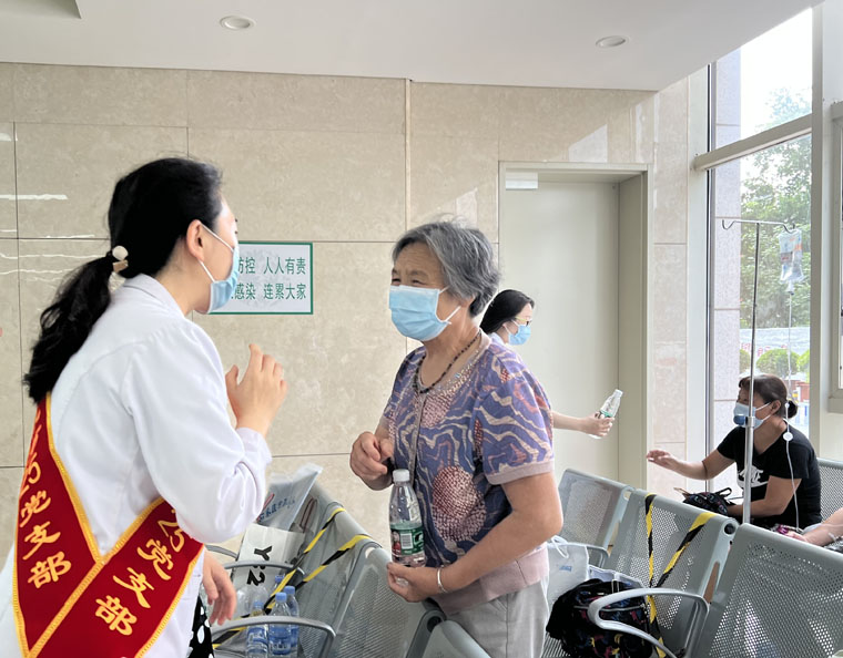 6月29日,第25党支部与第41党支部在医院本部联合开展暖心服务主题党日活动。在前庭广场休息区、急诊与门诊候诊区,支部成员为来院家属和患者讲解就诊流程及自助机使用方法、指引科室位置、疏导有序就诊、指导大家规范佩戴口罩、帮助行动不便及年老体弱者,并准备了矿泉水及口罩等便民物品,耐心细致解答相关问题,助力提升患者就医感受。