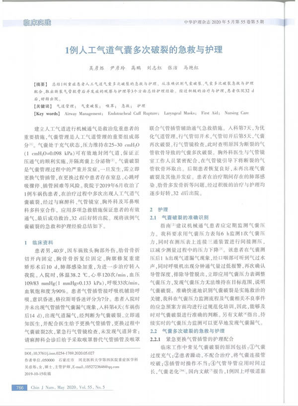 护理人员的科研能力亟待增强,在科室负责人胡振杰和护理部主任李来有的支持下,科室在2018年成立了护理科研小组,尹彦玲护士长带领着以吴彦烁为组长的科研团队,从临床中汲取思路,不断开拓创新,大力培养护理人员的科研能力。截至目前,ICU护理团队已经发表SCI论文3篇,中文核心期刊论文20多篇。其中尹彦玲护士长以第一作者发表SCI 2篇,吴彦烁在中华护理杂志发表论文2篇。尹彦玲护士长主持及参与编写书籍4部,包括人民卫生出版社出版书籍一部。目前,ICU护理科研团队已初步搭建完成,正在不断深入推进。