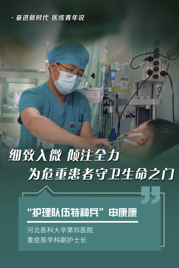 5月12日是第112个国际护士节,在传统观念中,“护理”这个职业总是与女性的“温柔”“细心”等形容词关联在一起。近年来,越来越多的男护士加入护理队伍,他们被亲切地称为“男丁格尔”。河北医科大学第四医院ICU的副护士长申康康身为“男丁格尔”,已经扎根在重症医学科17年,他不仅用青春诠释了对护理事业的执着与追求,也用奋斗一次次创造生命的奇迹。