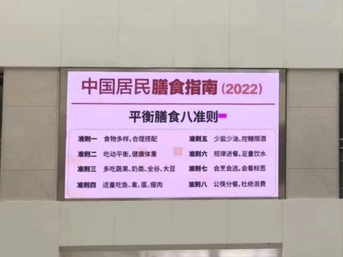 在营养周期间,医院门诊大厅屏幕滚动播放今年的主题及平衡膳食八准则,旨在让更多患者了解并重视营养,培养健康的膳食习惯。